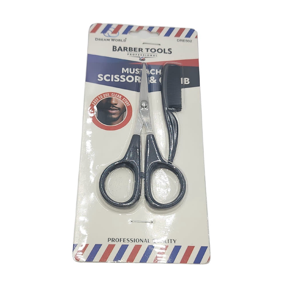 The DREAM WORLD PRODUCTS Barber Tools Mustache Scissor and Comb – DRE502 is a set of tools specifically designed for trimming and grooming mustaches. It includes sharp mustache scissors for precise trimming and a fine-toothed comb to detangle and style the mustache, achieving a polished look. Â Brand: DREAM WORLD PRODUCTS Color: Generally, the scissors are metal (often stainless steel) and the comb can vary in color, but it is often black. Material: Scissors: Stainless steel. Comb: Plastic or a similar material. Material Features: The scissors are designed to be sharp and durable, while the comb has fine teeth for precise styling. Number of Items: The set includes 1 scissor and 1 comb. Product Benefits: Allows for precise mustache trimming. Helps keep the mustache clean and groomed. The comb helps detangle and shape the mustache. Facilitates facial hair maintenance at home. Use: The scissors are used to trim mustache hair to the desired length. The comb is used to detangle and shape the mustache before and after trimming.