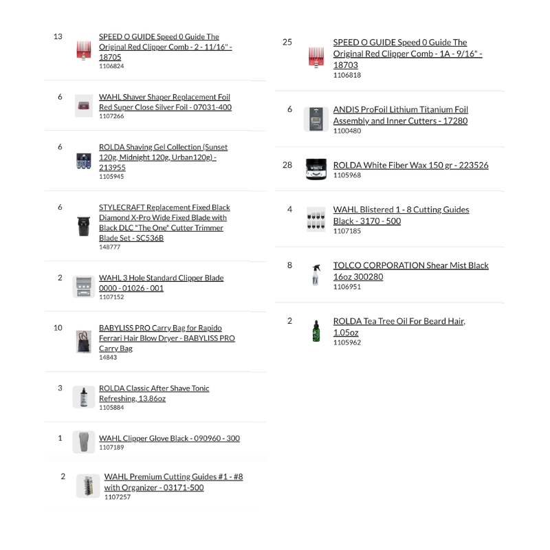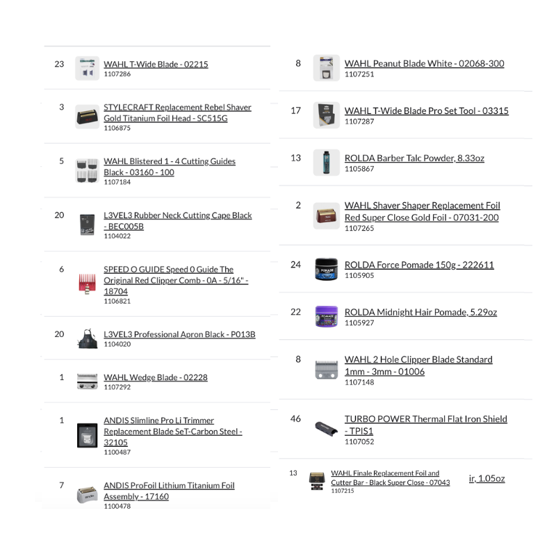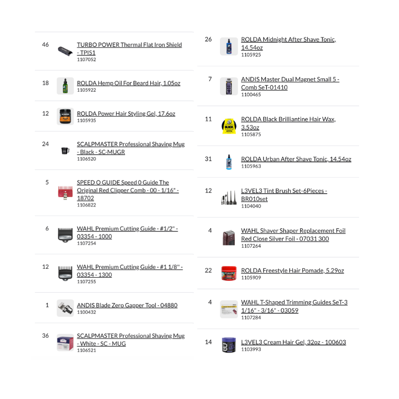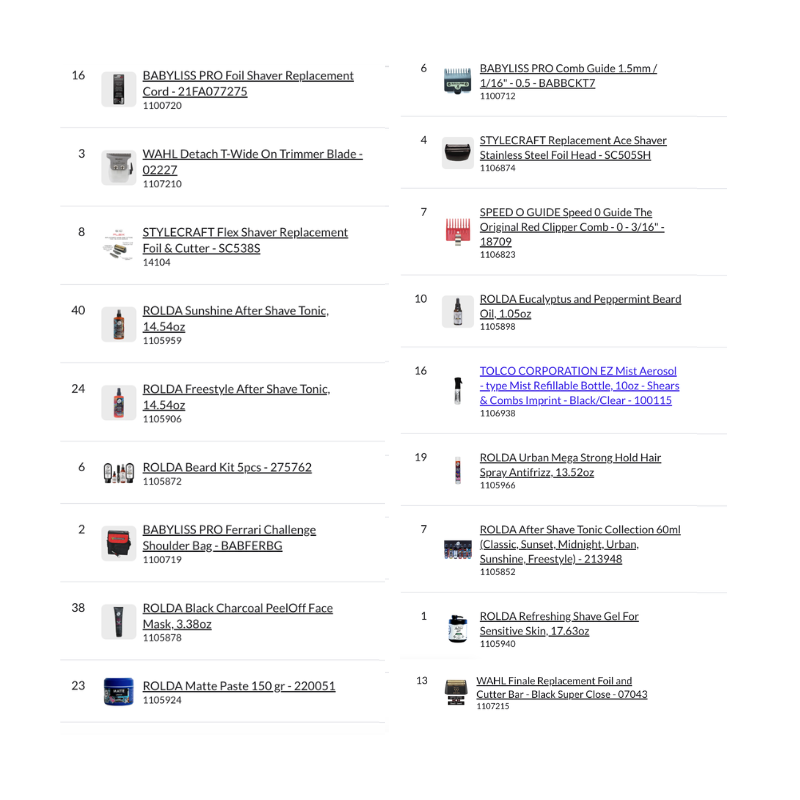 Bundle Pallet #18 – Barber includes a complete professional assortment of clipper and trimmer blades, replacement foils, cutting guides, barber tools, after shave tonics, pomades, beard oils, styling products, accessories, and professional barber equipment, making it a comprehensive barber supply pallet ready for retail or barbershop distribution.