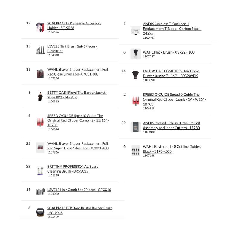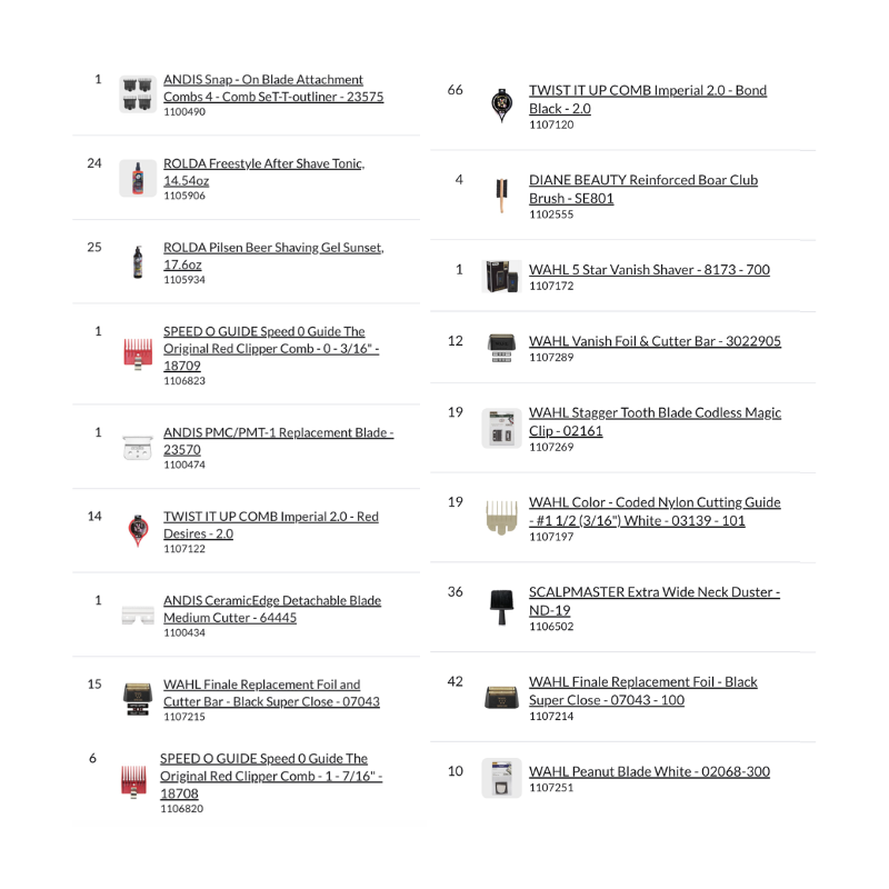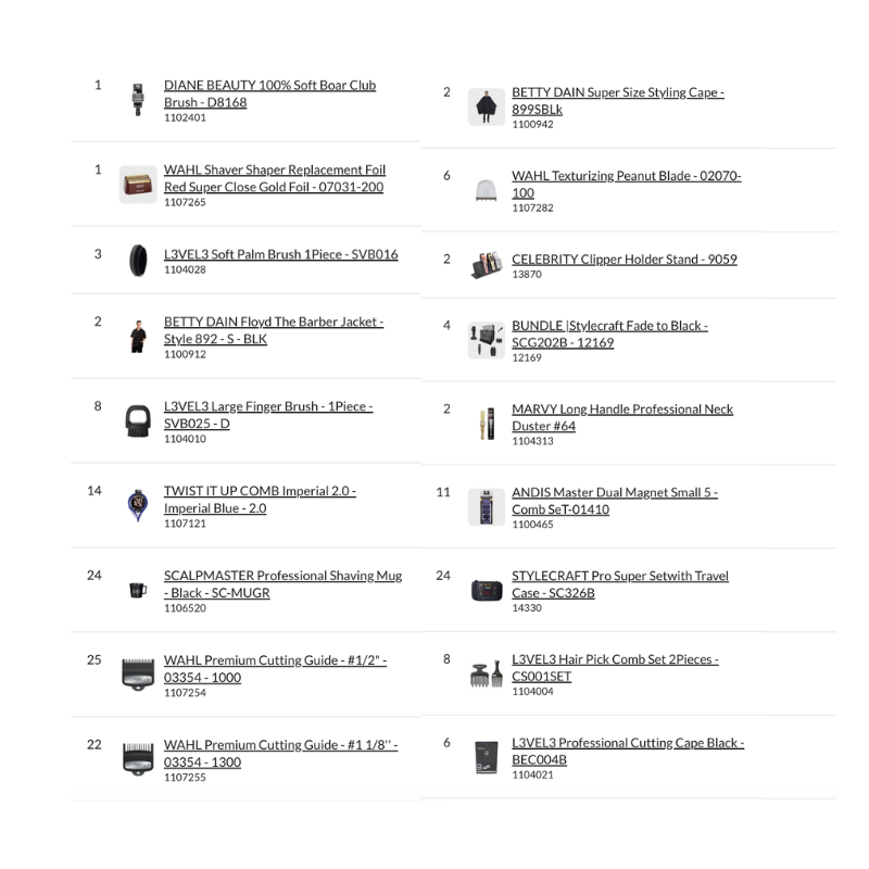 Bundle Pallet #21 – Barber includes a complete assortment of professional barber equipment, clipper blades, replacement foils, cutting guides, combs, capes, aprons, brushes, shaving gels, after shave tonics, and barber accessories. This pallet is ideal for barbershop operations, wholesale distribution, or professional retail supply.