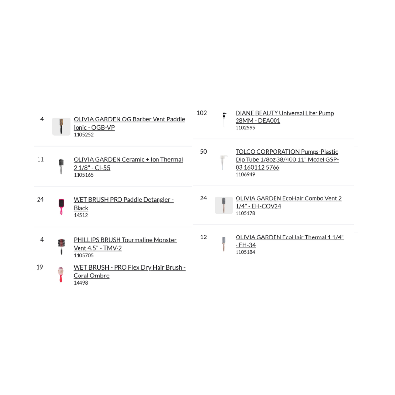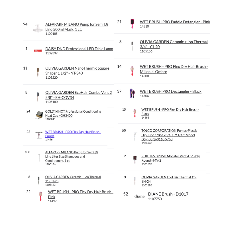 Bundle Pallet #46 – Hair includes a total of 1,179 individual units across 54 different product types. This pallet is a high-volume assortment of professional hair brushes, detanglers, thermal styling tools, pumps, and salon accessories from well-known brands such as Wet Brush Pro, Olivia Garden, Diane Beauty, Phillips Brush, Alfaparf Milano, and more.