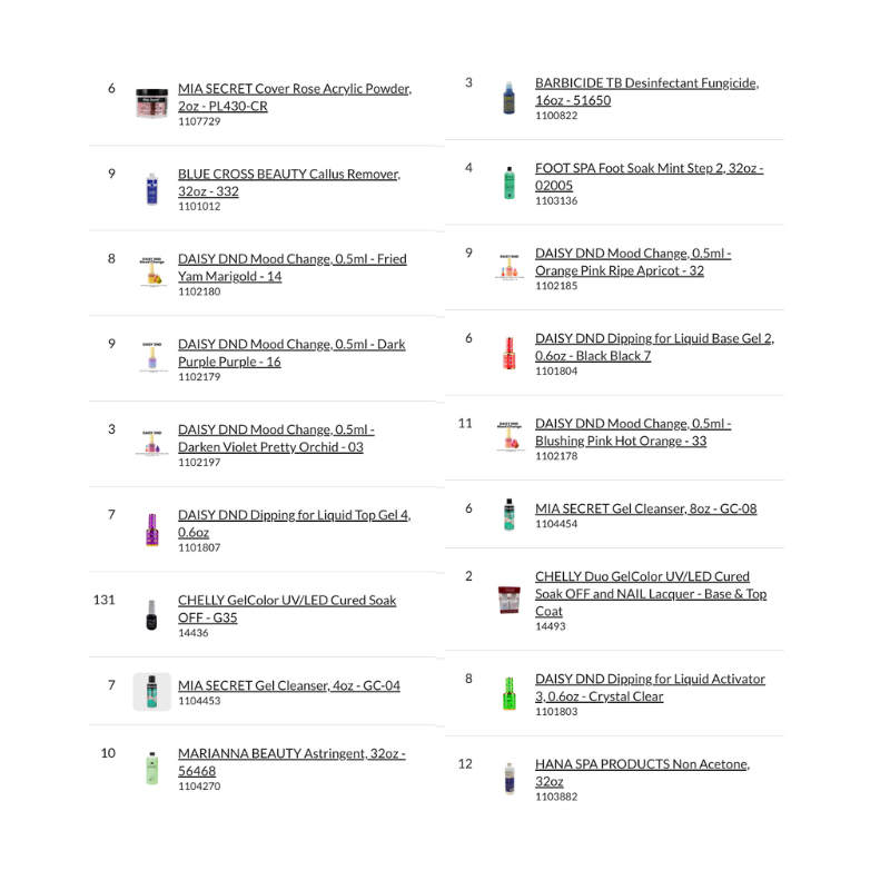 Bundle Pallet #49 – Nails includes a high-volume assortment of professional gel polishes, mood change colors, acrylic powders, base and top coats, dipping systems, cuticle oils, removers, disinfectants, and manicure accessories.