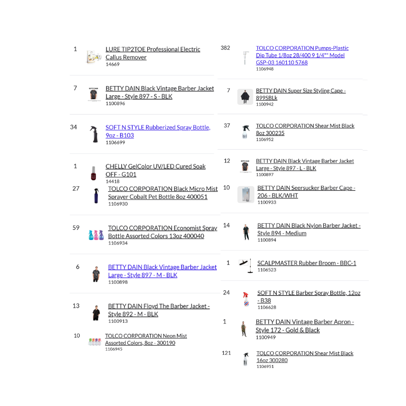The Bundle Pallet #46 – Barber includes a total of 1,342 professional barber items, featuring a strong mix of capes, jackets, aprons, spray bottles, pumps, nail essentials, and salon accessories. This pallet is ideal for barbershops, beauty supply stores, and resale businesses looking for high-volume inventory.