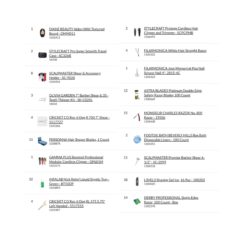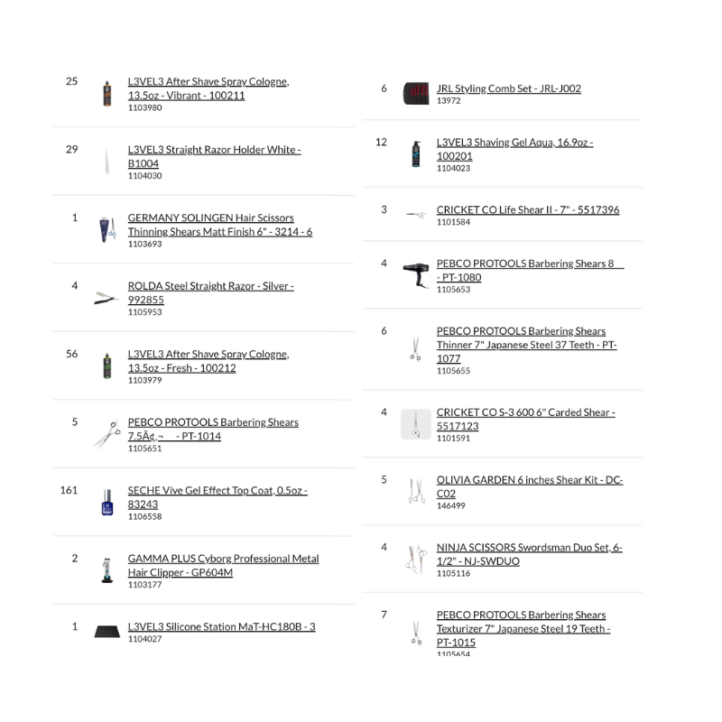 Bundle Pallet #57 – Small Barbershop includes a complete assortment of professional barber tools such as clippers, trimmers, straight razors, double edge blades, barber shears (standard and thinning), shaving gels, after shave colognes, styptic products, disinfectants, appointment books, station mats, and essential barber accessories.