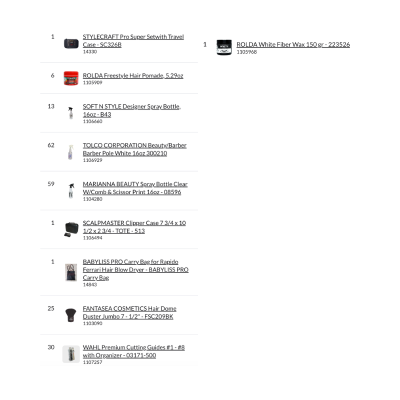 Bundle Pallet #62 – Barber includes a strong assortment of professional barber spray bottles, mist bottles, neck dusters, clipper cleaning brushes, styling pomades, gels, waxes, cutting guides, barber combs, tool cases, and barber accessories.
