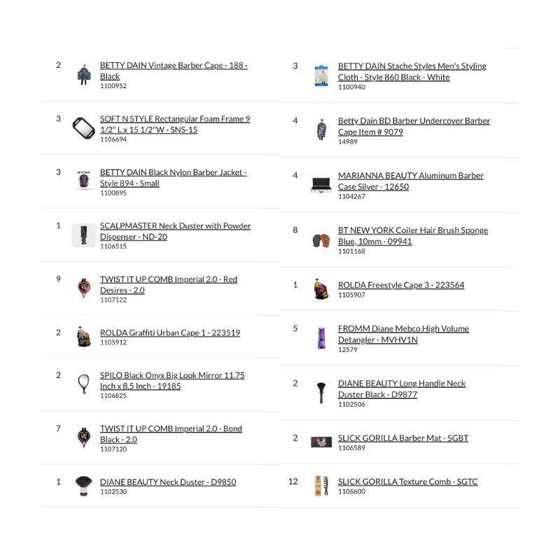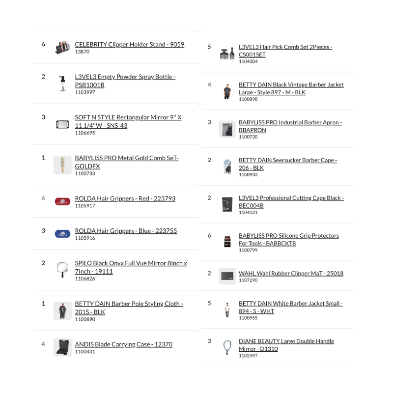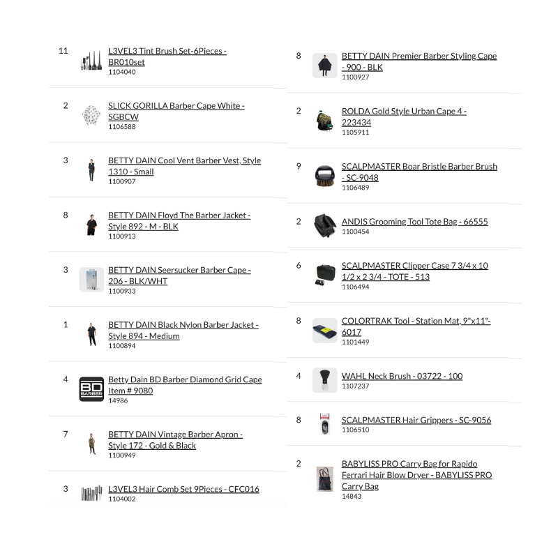 Bundle Pallet #69 – Barber includes a complete professional assortment of barber capes, jackets, aprons, mirrors, mannequin heads, gloves, brushes, combs, clipper accessories, neck dusters, barber mats, storage cases, and grooming tools. This pallet is ideal for barbershop setups, training academies, wholesale distribution, or professional barber supply retail inventory.