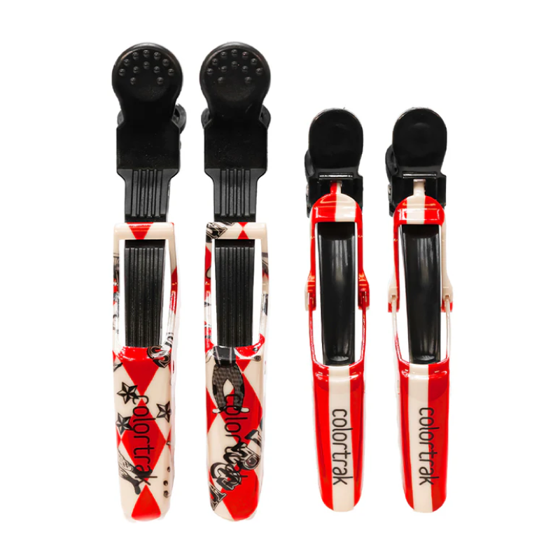 Infuse your styling routine with the mystique of the circus using our 4-pack of Croc Clips. Each clip is adorned with illustrations of mesmerizing oddities, eccentric performers, and enigmatic curiosities, adding a touch of the bizarre to your work. With 2 regular double-hinged Croc Clips and 2 Jumbo Croc Clips designed to hold large amounts of hair, you’ll have both style and functionality at your fingertips. Brand: Colortrak Color: black and circus print Number of items: 4 Clips Materials: Plastic Product features:Superior Grip: Designed for a superior grip on a larger surface area, giving stylists better control. Double-Hinged Design: Provides superior grip and control. Ergonomic Thumb-Grip: Ensures comfortable and precise use. Rubberized Finish: Prevents slippage for a secure hold. Quick Sectioning: Designed to make sectioning hair fast and efficient. Voluminous Hair: Designed to provide superior grip on a larger surface area, giving stylists better control.