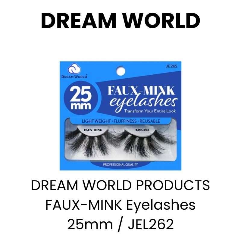 DREAM WORLD PRODUCTS FAUX-MINK Eyelashes 25mm are false eyelashes designed to provide a dramatic and voluminous look. They are made from synthetic materials that mimic the appearance and softness of mink but are cruelty-free. Their 25mm length makes them ideal for those seeking significant visual impact. DREAM WORLD PRODUCTS FAUXMINK Eyelashes 25mm Brand: Dream World Products Color: Black JEL251 Material: Synthetic hair (faux mink) Number of items: 1 pair Product Benefits: Provide extreme length and volume for a striking look. Made of soft synthetic material that mimics mink. Cruelty-free. Can be reusable with proper care. Add drama and depth to any makeup look.