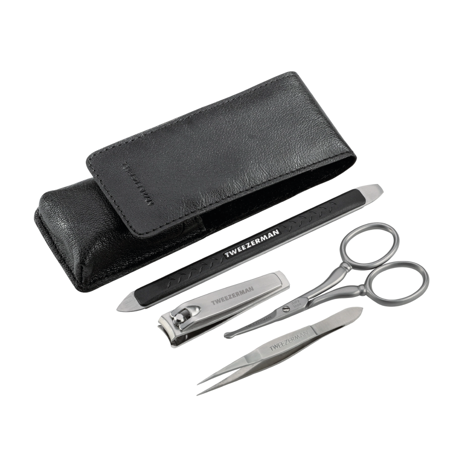 The TWEEZERMAN Essential Grooming Kit (model 40871-MG) is a convenient set of four premium quality tools designed for precision grooming of brows, face, and nails, ideal for use at home or while traveling. The kit includes a Tweezerette for removing unwanted brow and ingrown hairs or splinters, Facial Hair Scissors for safely trimming facial, nose, and ear hair, a Fingernail Clipper with a curved blade for precise nail trimming, and a Multi-Use Nail Tool that combines a cuticle pusher, an under-the-nail cleaner, and a nail file for comprehensive nail maintenance. The kit comes with a convenient carry case to keep the tools clean and protected. Â Brand: TWEEZERMAN Type of product:Essential Grooming Kit (4 pieces) Number of items: 4 (1 Tweezerette, 1 Facial Hair Scissors, 1 Fingernail Clipper, 1 Multi-Use Nail Tool), plus a carry case. Product Benefits: Comprehensive kit for brow, face, and nail grooming, includes tools for hair removal, trimming, and nail care, high-quality hand-filed edges for effectiveness, convenient carry case for travel and hygiene. Construction Material: Stainless steel (tools), material of case may vary (likely fabric or synthetic). Please Check packaging for accurate material list information. Specifications: 4-piece grooming kit including a Tweezerette, Facial Hair Scissors, Fingernail Clipper with curved blade, and a Multi-Use Nail Tool (cuticle pusher, nail cleaner, file), plus a carry case. How to use: Tweezerette: Squeeze the tips together to remove hair from the root. Scissors: Locate unwanted hair and trim in small sections, cutting visible hair only. Clipper: Lift and rotate the lever. Clip nails at an angle, starting at the corners and working inward. Nail Tool: Use the ends to push back cuticles and clean under nails. Use the file in the center to shape nails. Disinfect tool tips with alcohol or peroxide after each use. Disclaimer: Improper use of our products is the customer’s responsibility. Dukanee Beauty Supply is not liable for physical damages, allergies, or health problems resulting from misuse. Always consult the ingredients and materials before purchasing. Keep products out of reach of children. Product information may vary; refer to the packaging for precise details.