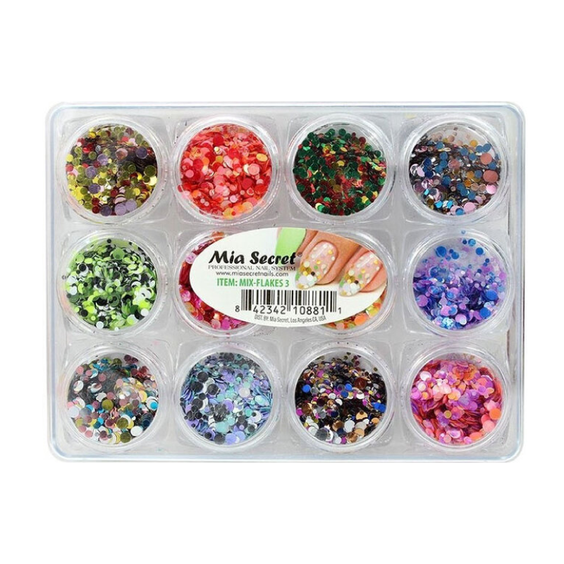MIA SECRET Flakes MIX 3 – MIX-FLAKES 3 is a unique and vibrant collection of fine, glittery decorative flakes, featuring a distinct mix of colors, shapes, and potential effects (such as iridescent or holographic) different from MIX 1 and MIX 2. These flakes are perfect for elevating any acrylic or gel nail design, allowing for the creation of personalized and eye-catching looks, from subtle accents to fully dazzling finishes. Their easy incorporation through encapsulation in acrylic or gel ensures a long-lasting and brilliant result. Â Brand: MIA SECRET Type of product: Nail decoration (flakes) Color: Mix of various glittery colors (different from MIX 1 and MIX 2) Content: One container with assorted decorative flakes Material: Fine flakes of glittery material (PET, cellulose, holographic, iridescent, etc.) Number of items: 1 Product Benefits: Offers an additional and distinctive selection of shine and texture for nails, encourages the creation of original and personalized nail designs, easily encapsulated in acrylic or gel for longer wear and an impactful finish. Construction Material: Glittery material. How to use: Apply a layer of wet base gel or acrylic to the nail. Using a brush, carefully spread or place the flakes onto the nail in the desired design. Ensure the flakes are well adhered to the base layer. Encapsulate the flakes with an additional layer of clear gel or acrylic. Cure the gel according to instructions or allow the acrylic to dry. File and shape if necessary, and finish with a top coat to seal and add shine. Disclaimer: Improper use of our products is the customer’s responsibility. Dukanee Beauty Supply is not liable for physical damages, allergies, or health problems resulting from misuse. Always consult the ingredients and materials before purchasing. Keep products out of reach of children. Product information may vary; refer to the packaging for precise details.