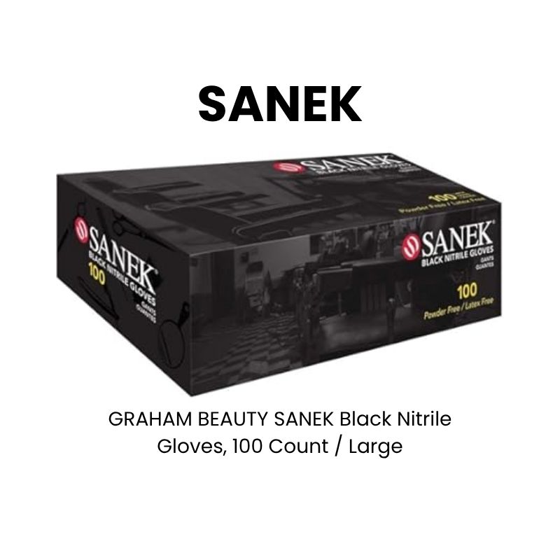The GRAHAM BEAUTY SANEK Black Nitrile Gloves are disposable, powder-free, and latex-free gloves designed for various professional applications, including barbering, salon services, and tattooing. Made from nitrile, they offer superior feel, fit, and durability compared to vinyl gloves. The black color helps to easily identify if the glove has been punctured. The “no glove feel” provides a high level of sensitivity and dexterity, allowing users to sense changes in water temperature quickly. They mold to the hand for a comfortable fit, even during extended use.