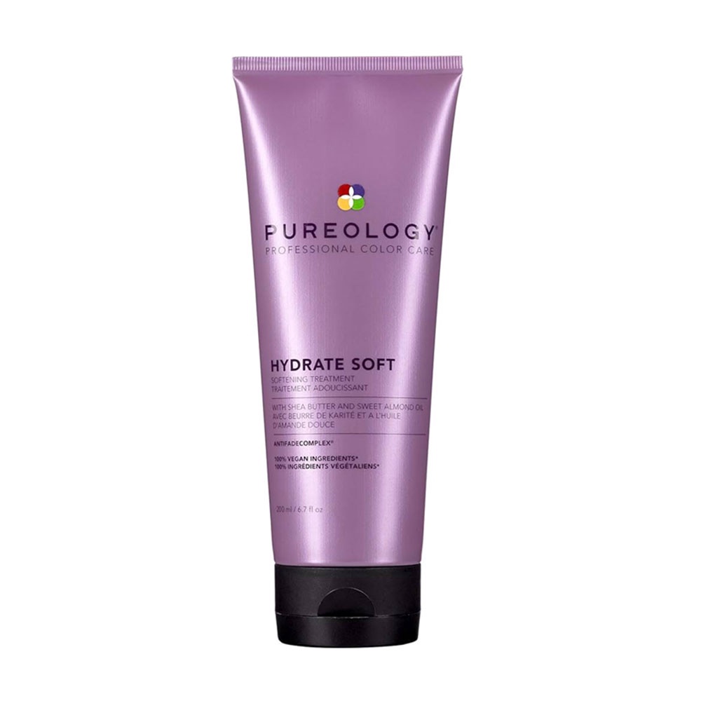 PUREOLOGY Hydrate Soft Softening Treatment is a nourishing treatment designed to soften dry, color-treated hair. This 6.7oz treatment is infused with Shea Butter and Almond Oil to replenish moisture and smooth strands, leaving hair with a velvet-soft finish. It features a signature aromatherapy blend of red fruits, rose, and amber, providing a captivating aromatic experience. The 100% vegan formula is free of sulfates and parabens, making it ideal for color-treated hair. Â
