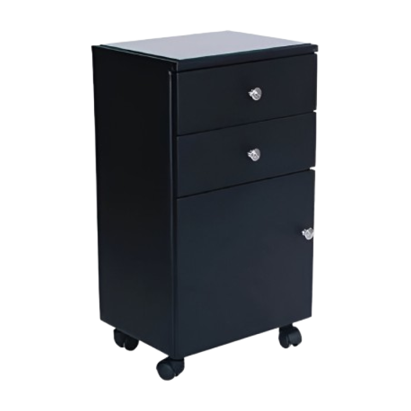 How to use the product: The side station is placed near the stylist or barber’s main workstation. Tools and supplies are stored on the shelves or in the drawers for easy access during client services. The top surface can be used for temporary placement of items or for quick preparation tasks. The wheels allow the station to be moved around the workspace as needed.