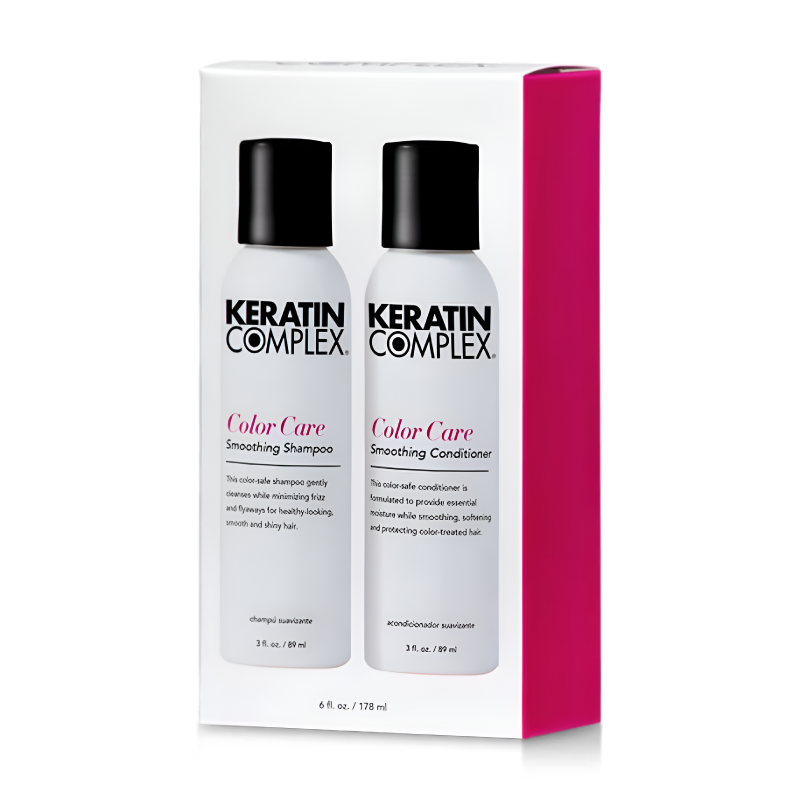 The KERATIN COMPLEX Color Care Travel Valet Duo is a set of two travel-sized products (3.0 oz each) specifically designed for the care of color-treated hair. This duo includes a shampoo and conditioner from the Keratin Complex Color Care line, formulated to gently cleanse the hair without stripping color, while also helping to fight frizz and provide softness and shine. Their compact size makes them ideal for travel or for trying the products before purchasing the larger sizes. Brand: KERATIN COMPLEX Type of product: Color care shampoo and conditioner duo (travel size) Color: N/A Content: 2 bottles of 3.0 oz (88.7 ml) each (shampoo and conditioner). Total Content: 6.0 oz (177.4 ml). Material Feature: Sulfate-free, safe for color-treated hair, helps prolong color vibrancy. Number of items: 2 Product Benefits: Gently cleanses without stripping color, helps prolong color vibrancy, fights frizz and flyaways, leaves hair soft, smooth, and shiny, strengthens and protects hair from damage. Ingredients: (Color Care Shampoo): Water, and other mild cleansing agents, color protection Ingredients:, hydrolyzed keratin. Please Check packaging for accurate Ingredient list information. Ingredients: (Color Care Conditioner): Water, conditioning agents, color protection Ingredients:, hydrolyzed keratin. Please Check packaging for accurate Ingredient list information. Quantity: Contains one 3.0 oz shampoo and one 3.0 oz conditioner. How t use: Wet hair thoroughly. Apply Color Care Shampoo and gently massage into scalp and hair until lather forms. Rinse thoroughly. After shampooing, apply Color Care Conditioner from mid-lengths to ends. Leave on for a few minutes and then rinse well. Disclaimer: Improper use of our products is the customer’s responsibility. Dukanee Beauty Supply is not liable for physical damages, allergies, or health problems resulting from misuse. Always consult the Ingredients: and materials before purchasing. Keep products out of reach of children. Product information may vary; refer to the packaging for precise details.