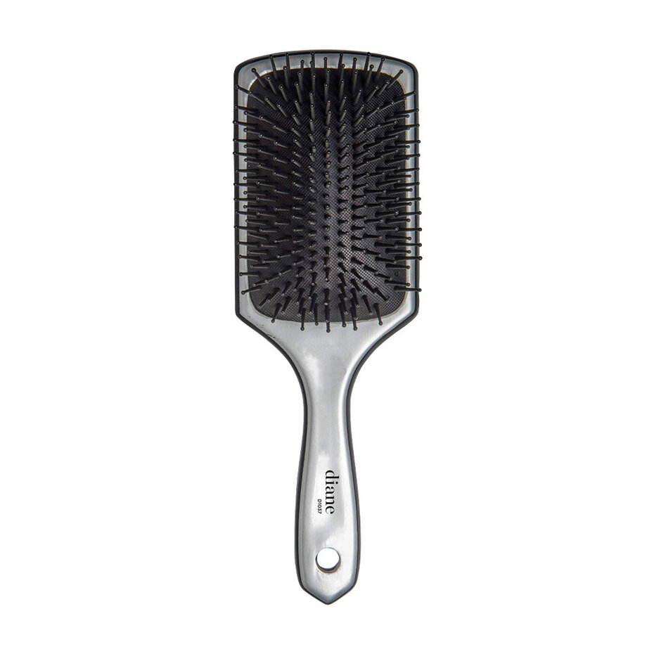 The DIANE BEAUTY Silver Large Paddle Brush (model D1037) features a large, cushioned paddle head with 13 rows of soft, plastic ball-tipped bristles. It has an attractive silver finish and is designed to gently detangle hair and smooth the hair’s surface. The cushioned base conforms to the scalp for comfortable brushing.