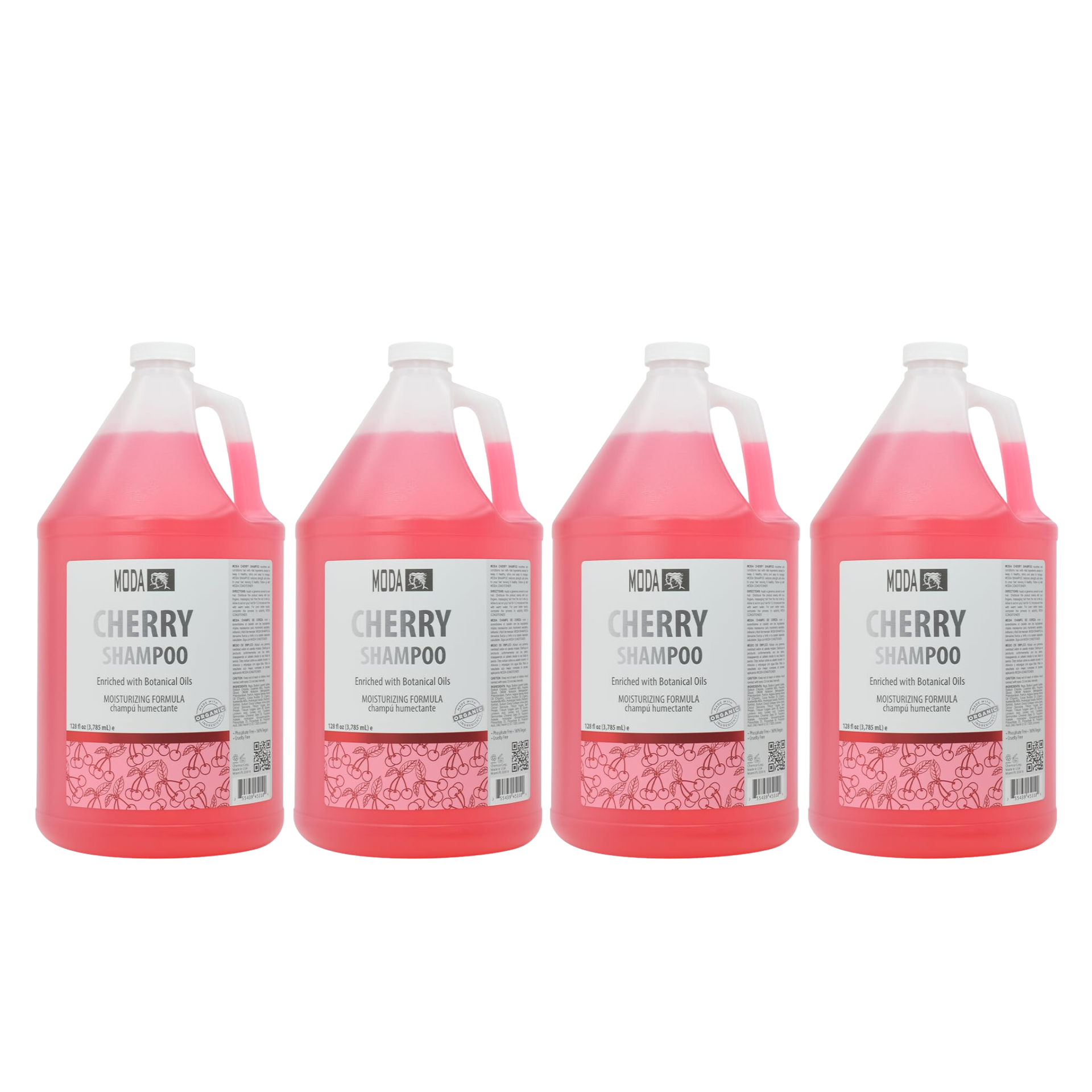 The MODA Cherry Shampoo is a gallon-sized (4 gallons) moisturizing shampoo designed to deeply cleanse hair while nourishing and restoring its strength and shine. Its silicone-free formula is ideal for professional use and is enriched with glycerin, keratin, panthenol, collagen amino acids, jojoba oil, and vitamin E, strengthening, protecting, and hydrating the hair.